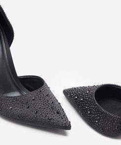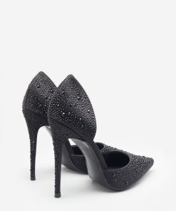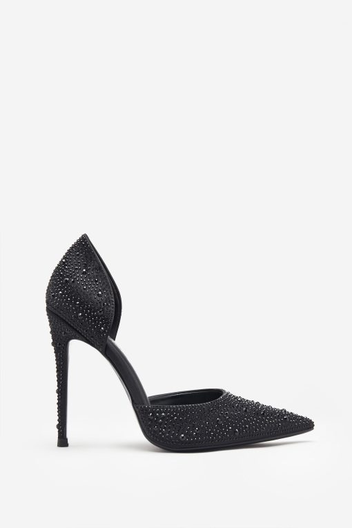 Seraphine London™ introduces a refined statement heel designed for evening elegance. Crafted from sleek black satin and adorned with crystal diamantés, this pointed court silhouette features an open arch and slender stiletto heel for a sculpted finish. Bold yet classic, it’s the perfect complement to your most polished looks.
