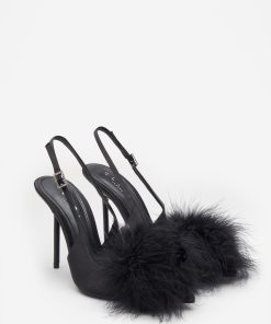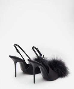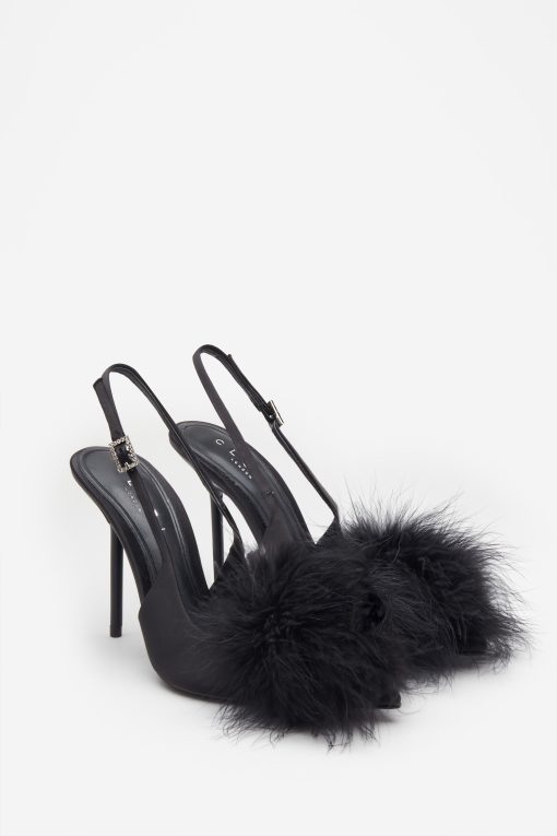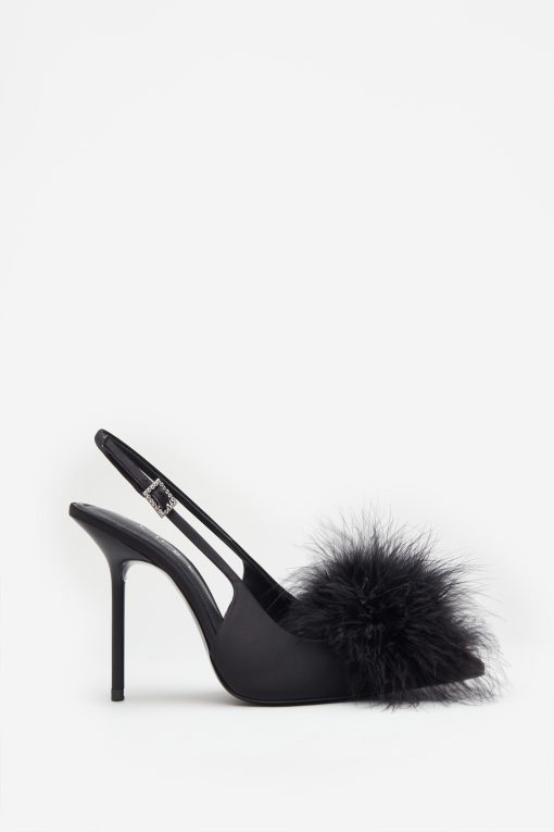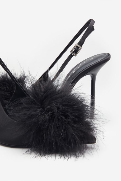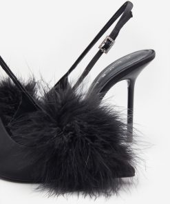 Seraphine London™ introduces a playful yet polished statement heel, perfect for standout occasions. Crafted from luxurious black satin, this pointed stiletto features a dramatic feather pom pom and a diamanté-adorned buckle. The adjustable slingback strap ensures a secure fit, while cushioned soles provide comfort through every elegant step.