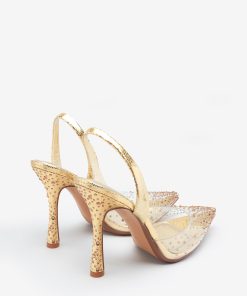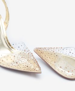 Seraphine London™ presents a shimmering court heel designed for elevated evenings and black-tie affairs. Crafted from glossy gold PU and adorned with crystal diamanté details, the silhouette features a pointed toe, slender stiletto heel, and slingback strap for a graceful, leg-lengthening finish. A cushioned sole ensures effortless wear from early arrivals to after-dark celebrations.