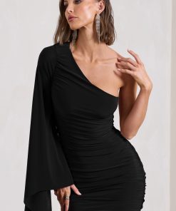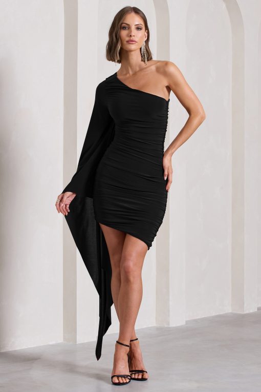 Seraphine London™ introduces a commanding silhouette made to captivate. This one-shoulder mini dress is crafted from signature stretch jersey and defined by a sculpting ruched body and dramatic cape sleeve. Finished with an asymmetric hemline for dynamic movement, the look balances power and elegance in one confident design.