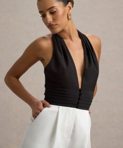 Seraphine London™ introduces a refined take on summer dressing with this structured yet playful playsuit. Designed in a premium stretch crepe and presented in an eye-catching palette of black and ecru, this piece features an extreme plunge neckline, sculpted waistband, and an open back with a functional self-tie bow. Scalloped hems and soft pleats bring femininity and movement, making this the perfect look for both sunlit strolls and elegant evening plans.