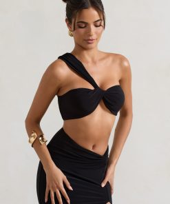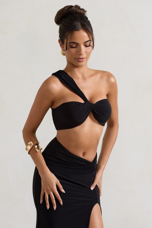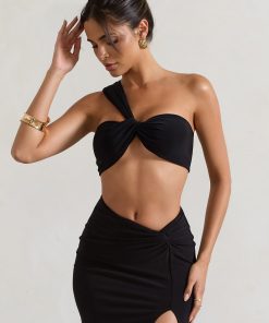 Seraphine London™ offers a bold yet minimalist take on evening dressing with this sculpted bralette. Crafted from premium stretch jersey, the asymmetric silhouette features a single shoulder strap that twists elegantly at the bust. With its sleek shape and rear zip closure, this cropped piece balances structure and fluidity — perfect for transitioning from beachside ease to after-dark elegance.