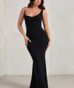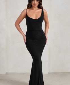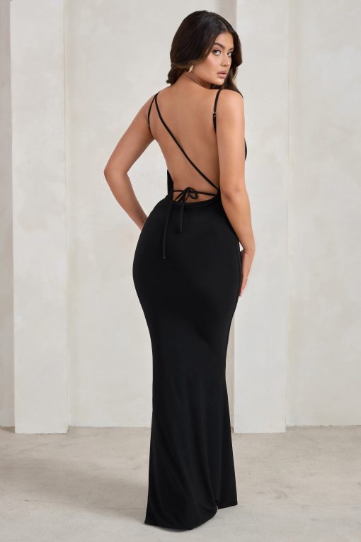 Turn every glance into admiration in the Black Pearl dress — an elegant silhouette with a subtle edge. Cut from premium black stretch jersey, this piece is draped with an asymmetric cowl neckline and finished with a sultry open back. Adjustable straps and a delicate tie closure ensure a flawless fit from every angle.