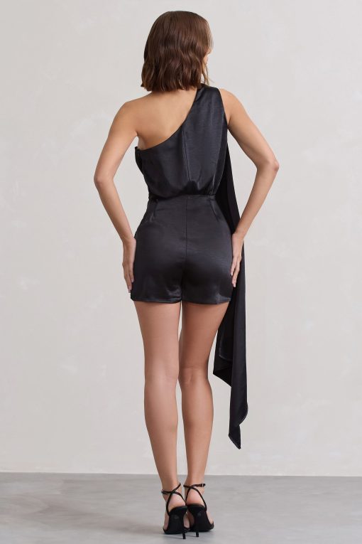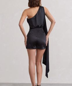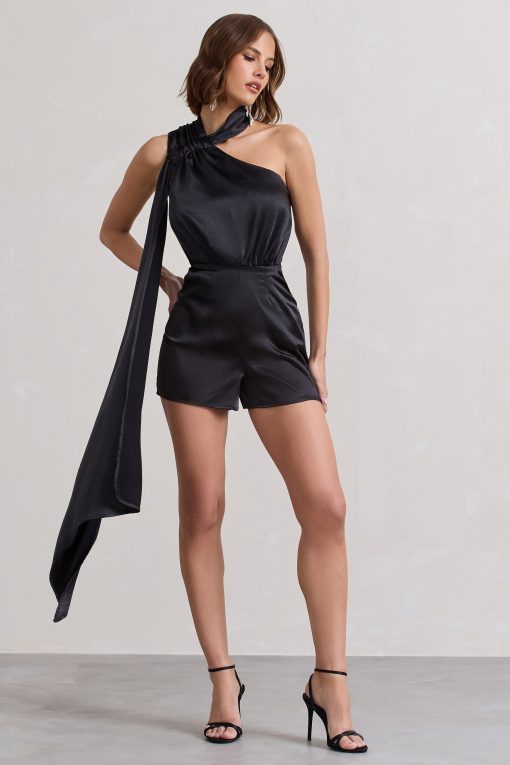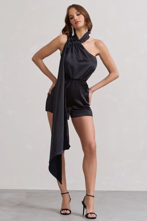 Seraphine London™ offers refined versatility with this elegant black playsuit, perfect for everything from race days to romantic ceremonies. Crafted from premium heavy satin, this sleeveless design features an asymmetric halter neckline, soft shoulder gathering, and a fluid, draped scarf for added drama. Designed to move with confidence and grace, this tailored one-piece is your go-to for elevated seasonal dressing.
