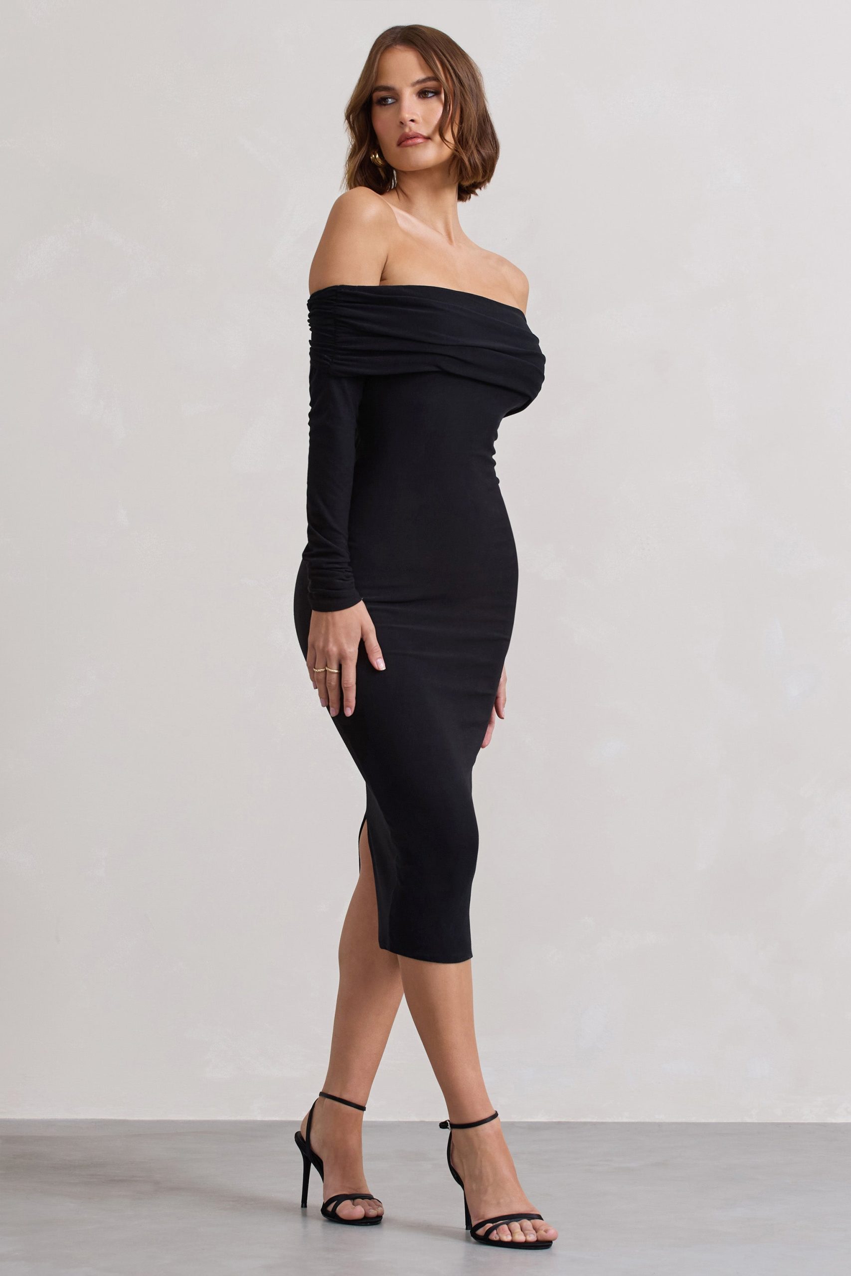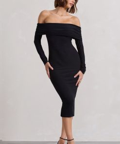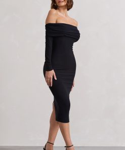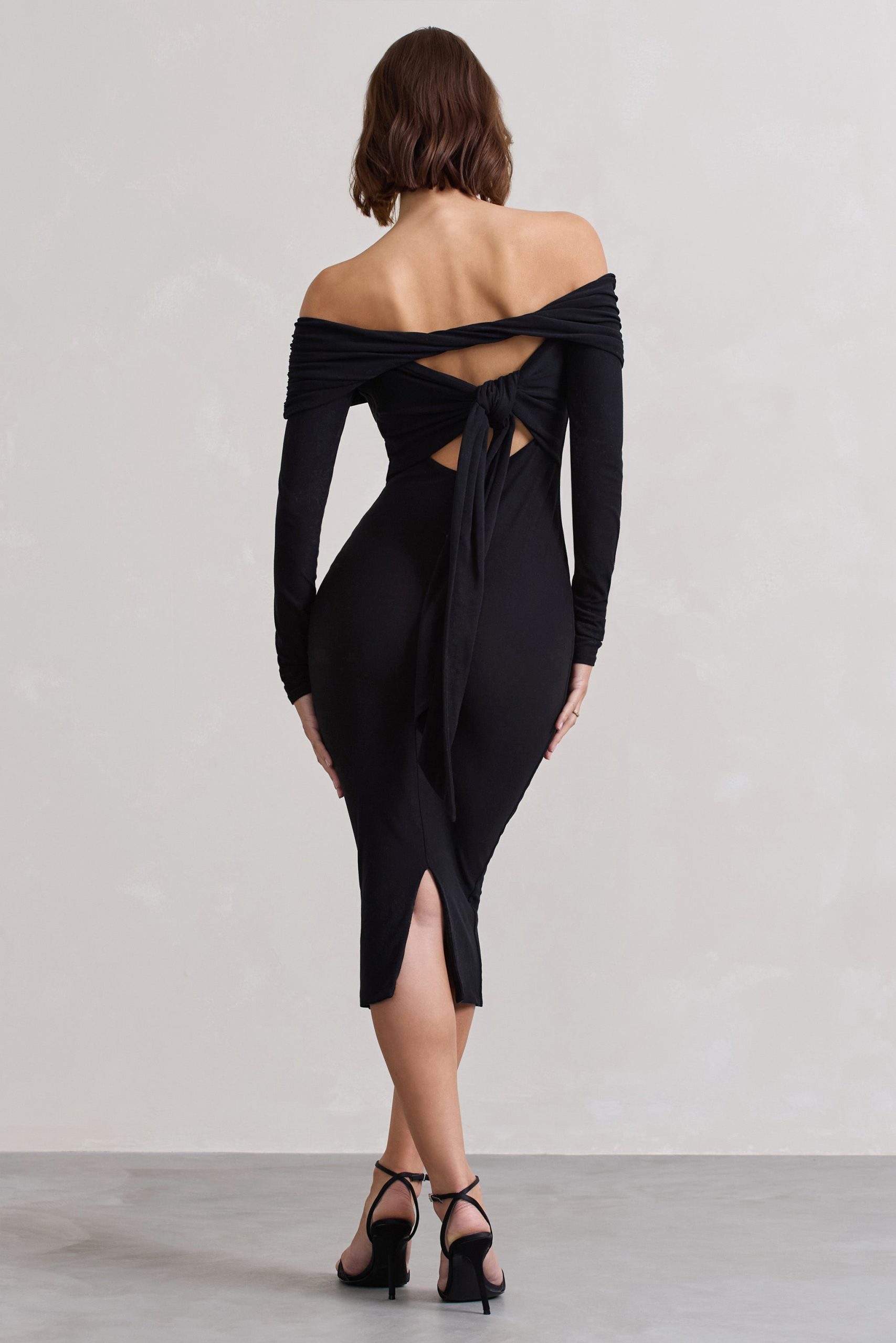 Effortless elegance begins with Black Void — a refined take on the everyday midi. Crafted from premium brushed jersey, this bodycon silhouette features a soft Bardot neckline and long sleeves for subtle sophistication. The open back, tied with a delicate bow, offers a contemporary twist that reveals just enough.
