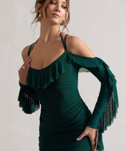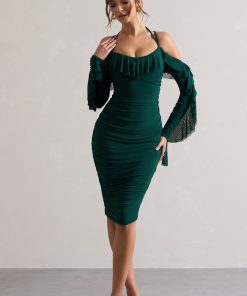 Seraphine London™ captures feminine strength and romantic edge in this sculpting midi silhouette. Crafted from premium stretch jersey in a deep bottle green, the design is fully ruched to contour the figure and features a sweetheart neckline paired with sheer ruffled sleeves. A lace-up open back and cold-shoulder detail add structure and sensuality — perfect for evenings that call for a bold impression.