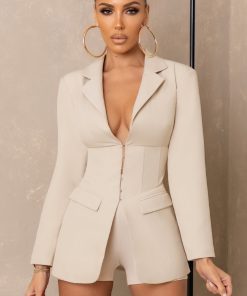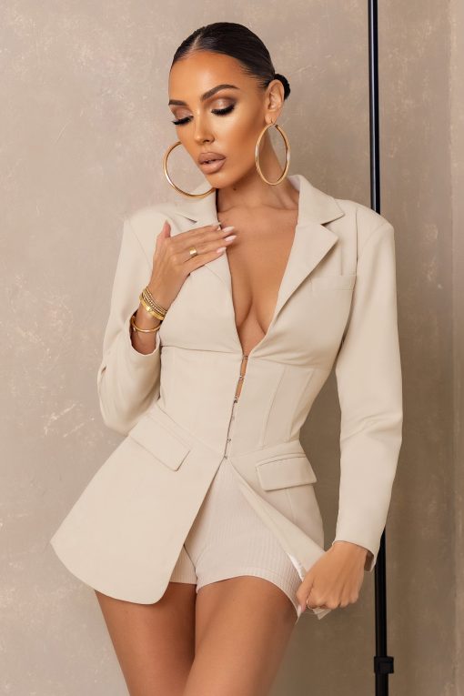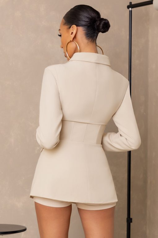 Seraphine London™ introduces a sophisticated take on power dressing with this cream corset blazer. Cut from premium heavy crepe, the tailored silhouette features a plunging notched collar, long sleeves, and a curve-enhancing corset waist. Refined yet daring, this statement piece transitions seamlessly from polished soirées to high-profile celebrations.