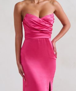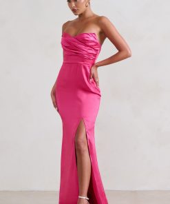 Command the room from the very first step in the Hot Pink dress — a bold, floor-sweeping statement made for unforgettable entrances. Cut from premium weighted satin, this strapless silhouette features a structured boned bodice and a fluid maxi skirt designed to move with grace. A high split along the left leg adds just the right amount of drama.