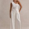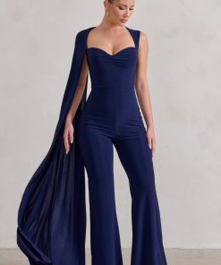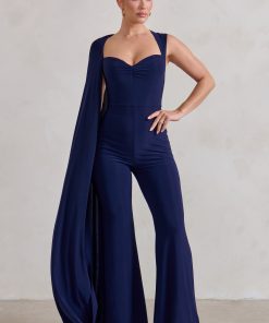 Seraphine London™ blends refined structure with graceful movement in this striking navy jumpsuit. Designed in premium stretch jersey, this tailored silhouette features a sweetheart neckline, shoulder straps, and a fluid asymmetric cape sleeve that cascades over the arm. Wide legs add elegant flow, making this the perfect style for weddings, soirées, and any special occasion that calls for understated glamour.