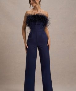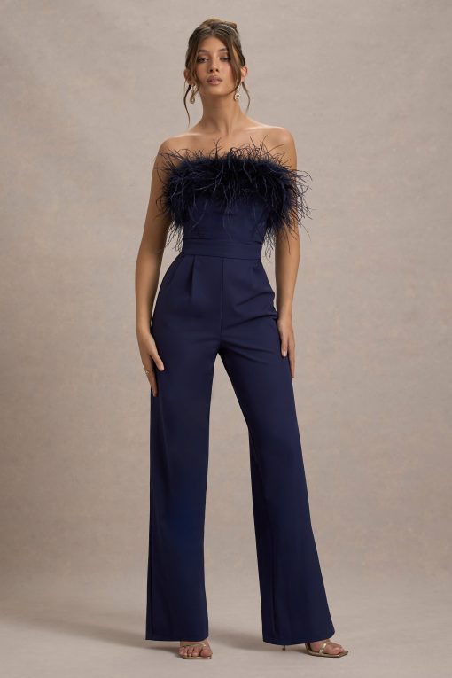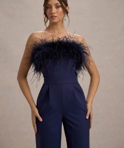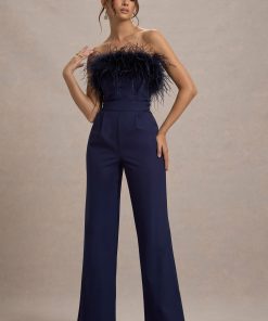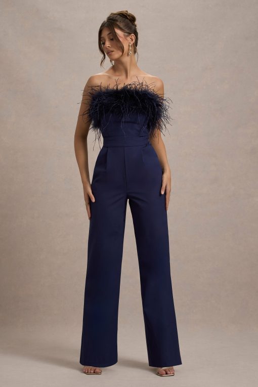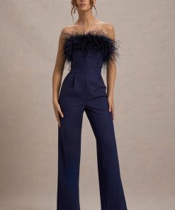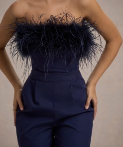Seraphine London™ introduces an unforgettable showpiece for the party season ahead. Designed in sculpting stretch crepe, this strapless navy jumpsuit features a structured boned bodice, sweeping wide legs, and a luxe feather trim that adds elevated drama. Both bold and refined, this design is your go-to for glamorous evenings where effortless sophistication takes center stage.