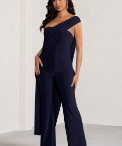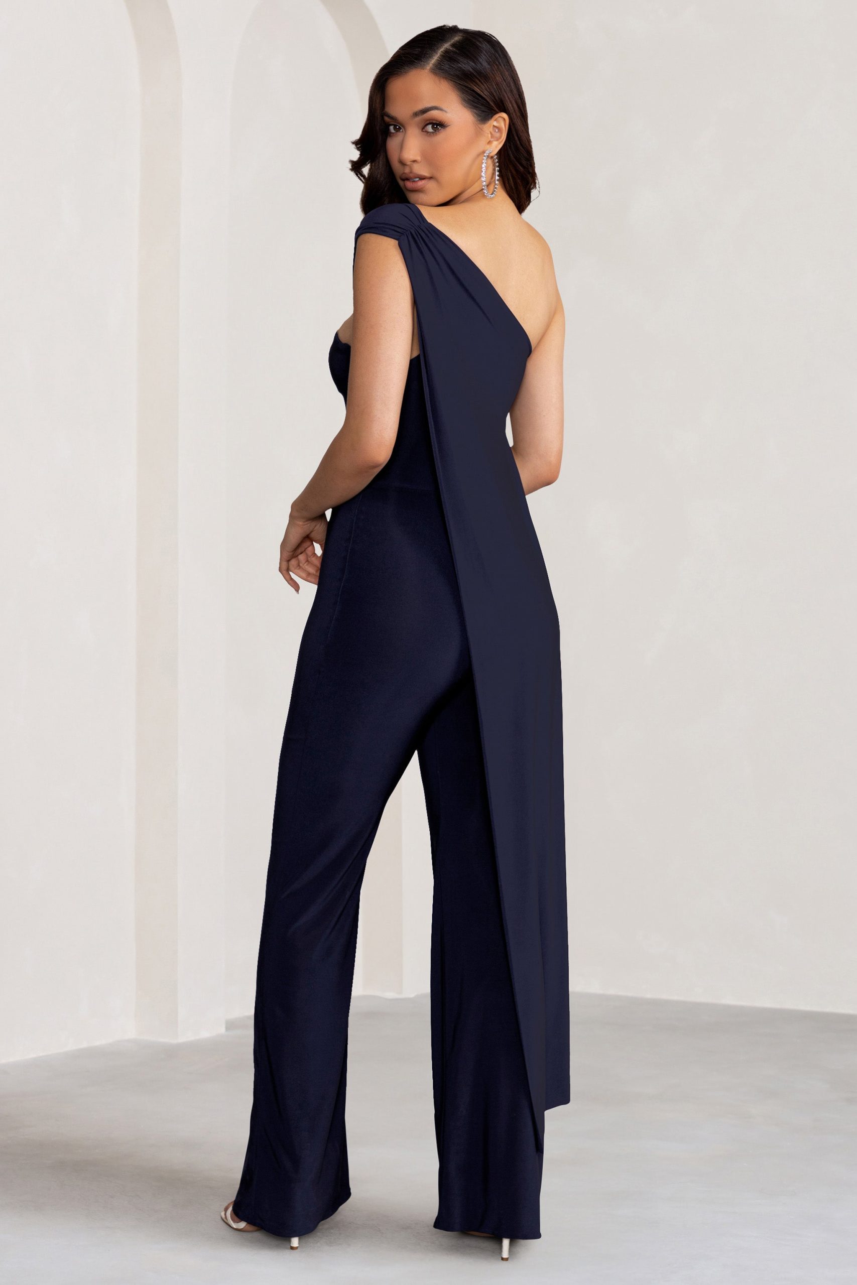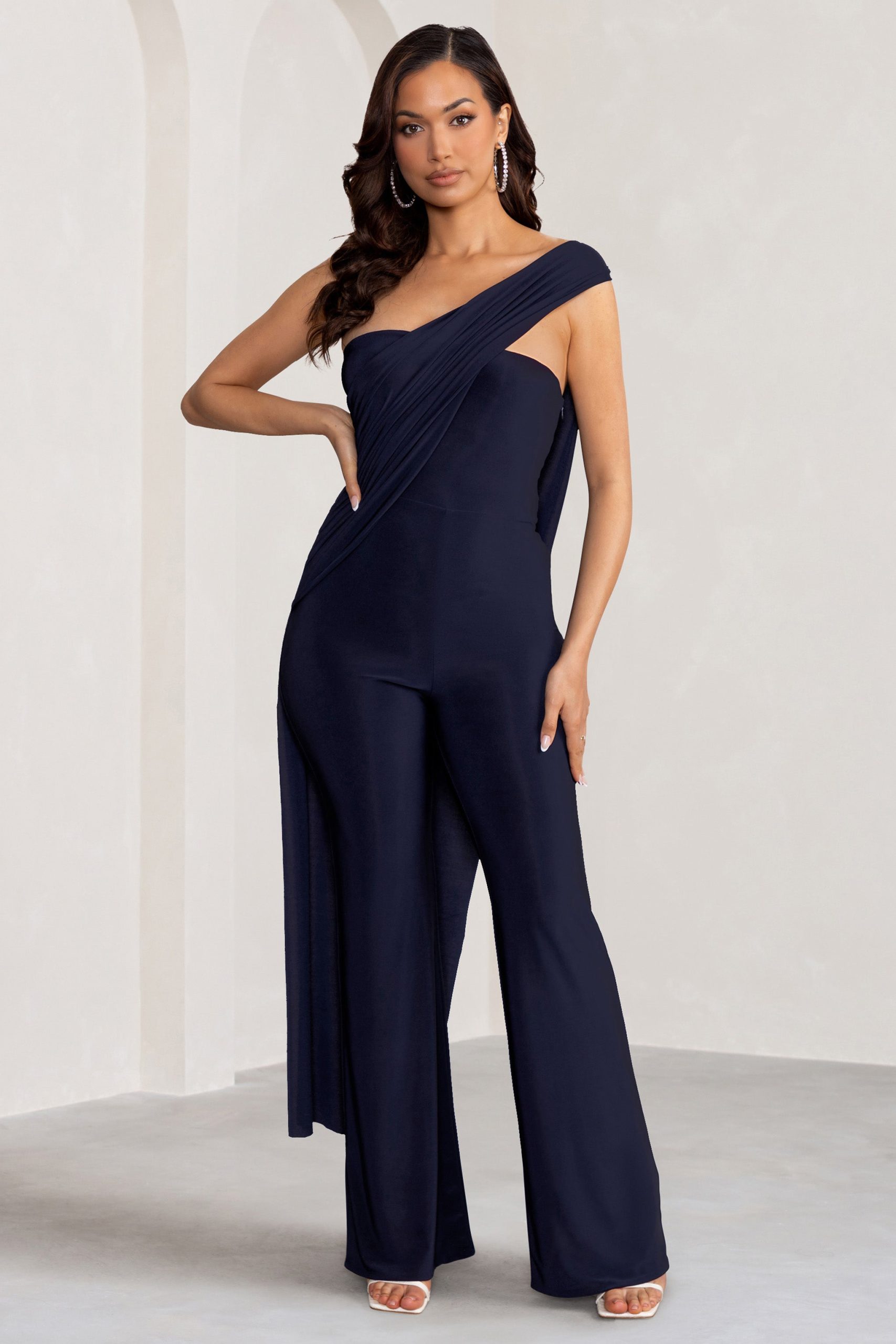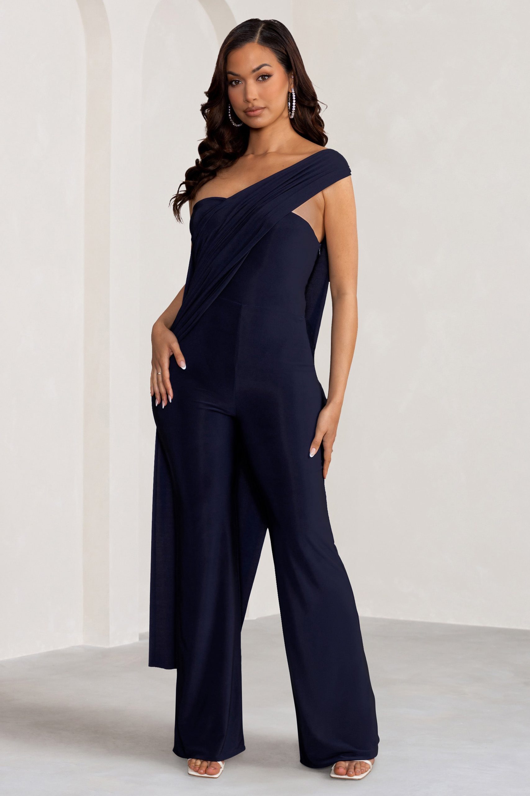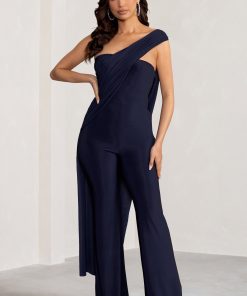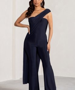 Seraphine London™ captures modern elegance with this draped navy jumpsuit, designed to make an impact at any upscale occasion. Crafted from ultra-stretch premium jersey, this figure-flattering silhouette features an asymmetric one-shoulder neckline, a dramatic cape detail, and elongating wide legs. Polished yet effortless, this statement piece is ideal for weddings, galas, and black-tie affairs alike.