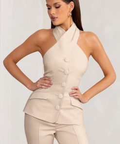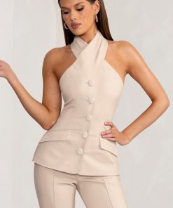 Seraphine London™ introduces a refined sleeveless blazer top tailored to perfection. Cut from a premium cotton blend in a classic stone hue, this structured silhouette features a halter neckline, front button fastening, and defined pocket detailing. A polished choice for both elevated evenings and modern daytime styling — confident, sharp, and unmistakably elegant.