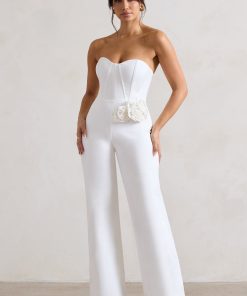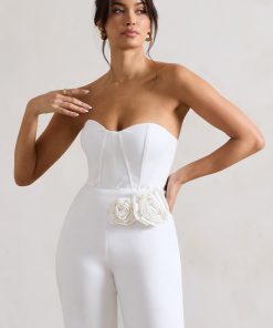 Seraphine London™ reimagines classic tailoring with a romantic twist in this refined white jumpsuit. Crafted from a premium cotton blend, this strapless design features a sculpted corset-style bodice and sweetheart neckline for a flattering, feminine fit. A delicate floral corsage accents the waist, while the straight-leg cut offers timeless versatility. Ideal for weddings, garden parties or elevated summer events.