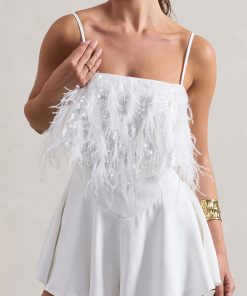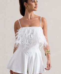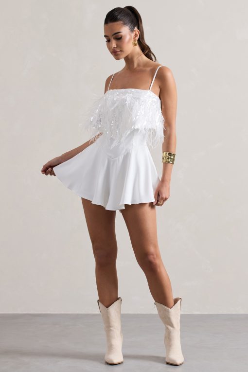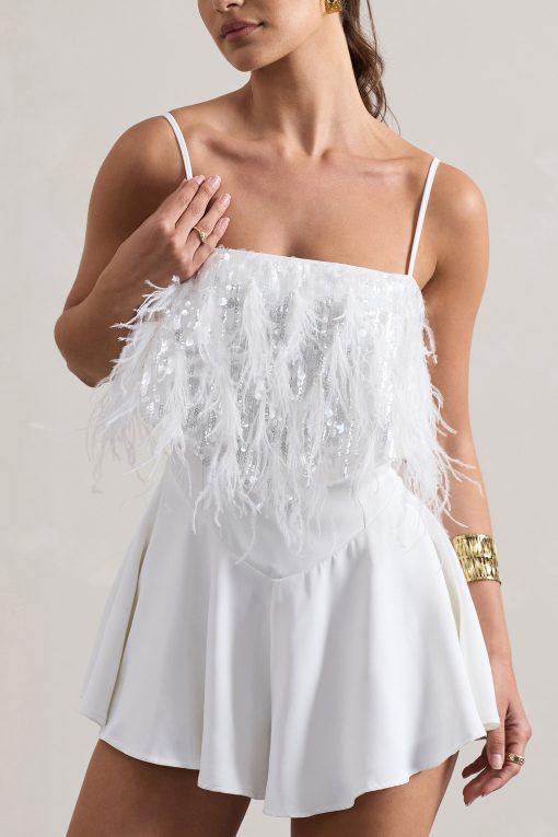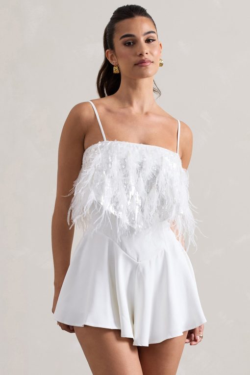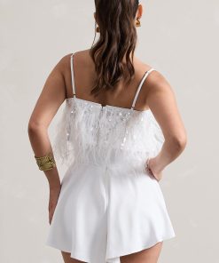 Seraphine London™ introduces a head-turning festival favourite with this dazzling white playsuit. Crafted from premium crepe and adorned with shimmering sequins, this strappy silhouette features adjustable cami straps, feather trims, and a floaty hemline that moves with effortless charm. Designed to command attention, this style is the perfect blend of playful glamour and elevated detailing.