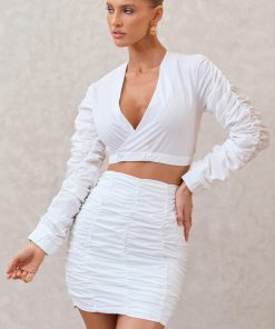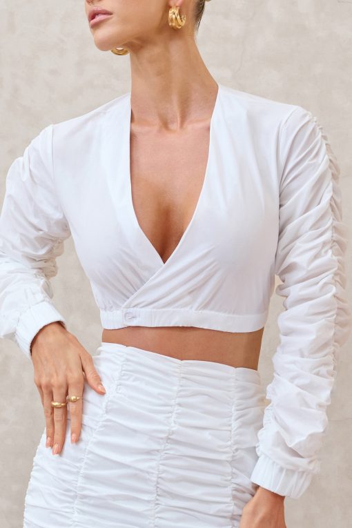 Seraphine London™ presents a fresh take on shirting with this crisp cropped wrap silhouette. Designed in structured white poplin, this long-sleeve top features ruched detailing, a plunging V-neckline, and a flattering wrap front. The sculpted fit is perfect for transitional styling — whether paired with its coordinating skirt or elevated with tailored separates.